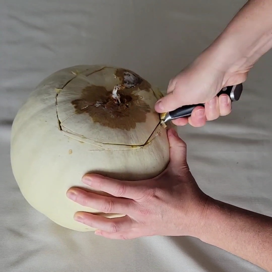 Ensuite, découpez le dessus de la citrouille pour en faire un couvercle (comme pour un Jack-O’-Lantern). L’ouverture doit être suffisamment large pour accueillir vos plantes et vos décorations.